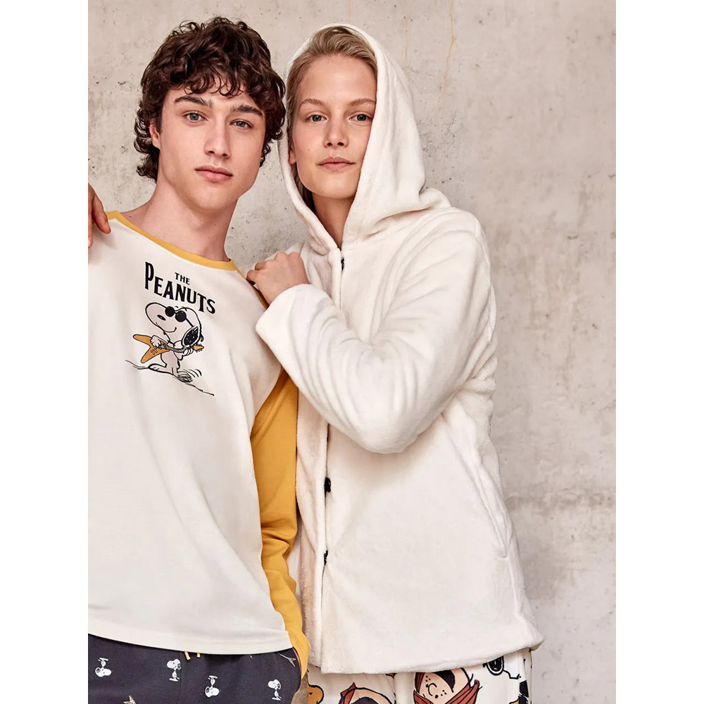 Bata en tejido peluche extrasuave con capucha y botones tipo clip invisibles, con bolsillos laterales y forrada en algodón.