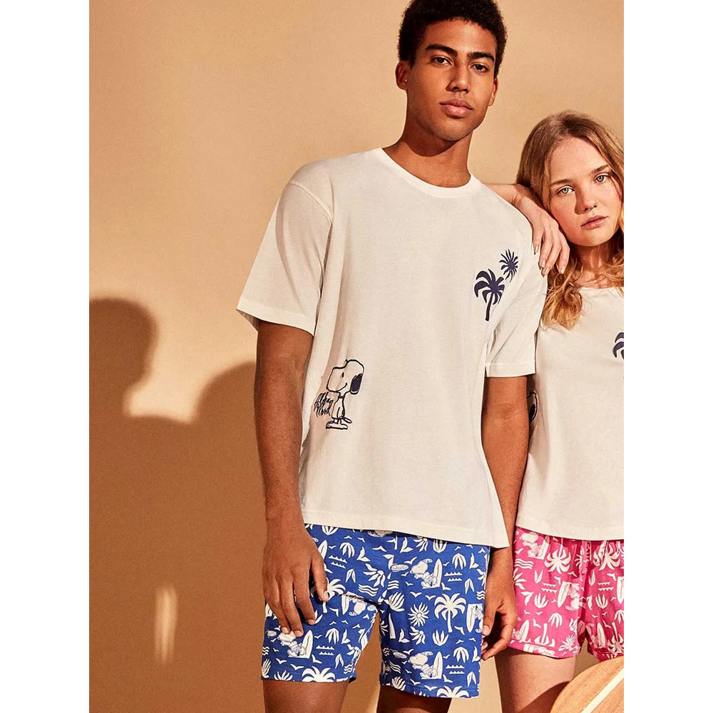 Pijama hombre Snoopy, confeccionado 100% algodón. Camiseta cuello redondo con estampado con relieve y short estampado tropical color marino, con cinturilla rizada y bolsillos laterales.