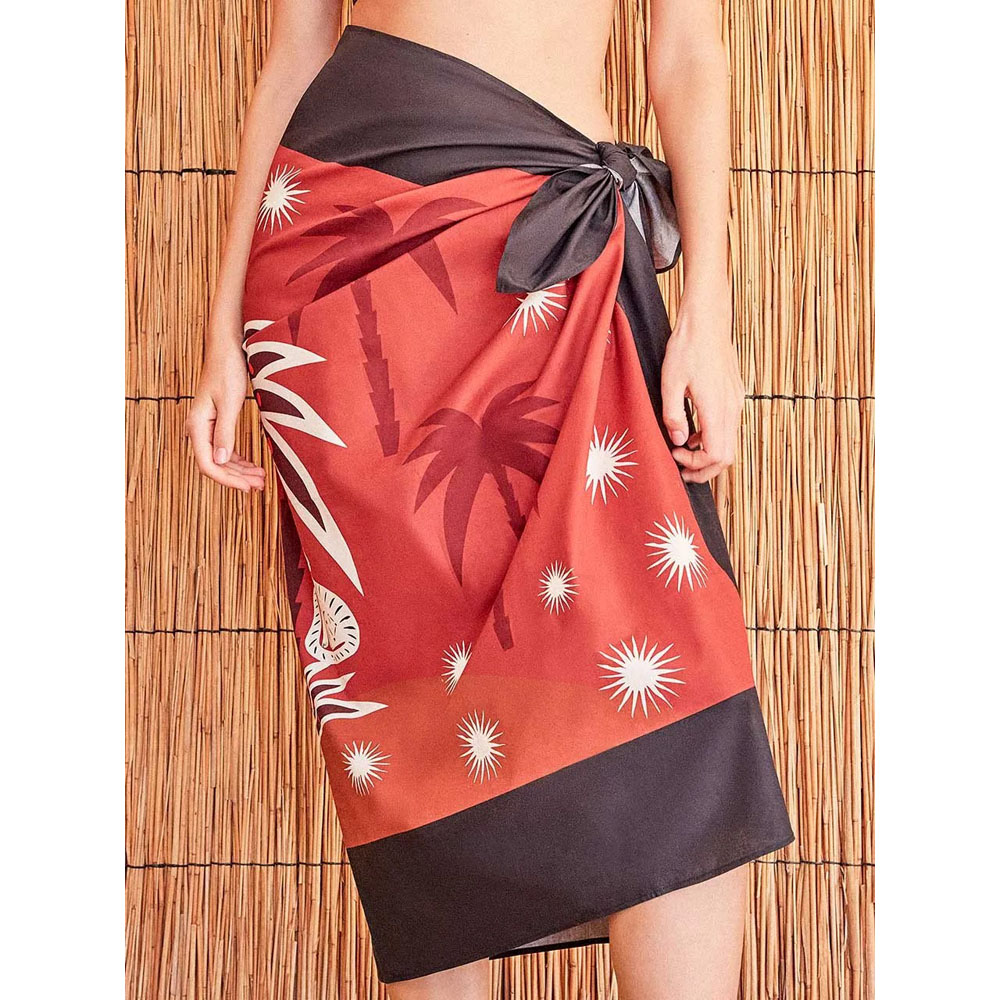 Saltar al contenidoPareo 100% algodón de fondo rojo con marco en negro, estampado con motivos étnicos