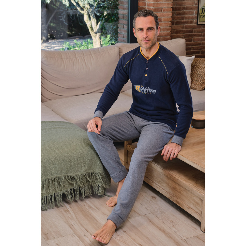 Pijama de punto milano. Camiseta de color azul marino con print en el pecho, tapeta con cierre de botones y puños en las mangas. Pantalón liso de color gris con puños en los bajos.