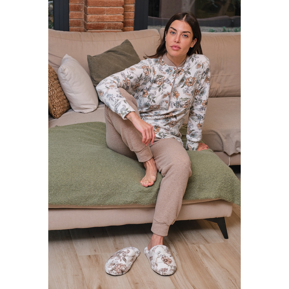 Pijama de punto milano. Camiseta con estampado floral, tapeta con cierre de botones y puños en las mangas. Pantalón liso con puños.