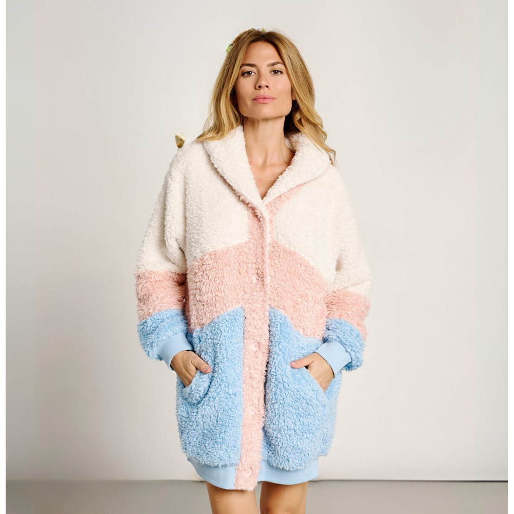 Bata corta de borreguito que combina celeste, rosa y crudo. Cierre de botones cuello envolvente y bolsillos laterales.
