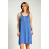 Camisón de sisa de modal en color celeste con estampado de flores blancas. Tapeta de tres botones en el escote y detalle de volante en el bajo del mismo tejido. Comodidad y frescor para las noches de veano.