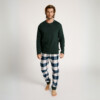 Pijama con camiseta de algodón interlock de color verde oscuro, con cuello con tapeta de tres botones y bolsillo en la parte izquierda del pecho. Pantalón de franela con estampado de cuadrops en blanco y verde, con puños en los bajos, bolsillos laterales y lazo de ajuste en la cintura.