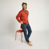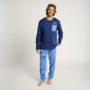 Pijama de algodón interlock. Camiseta de color azul oscuro con print en el pecho. Pantalón de color teja, con puños en los bajos, bolsillos laterales y lazo de ajuste en la cintura.