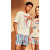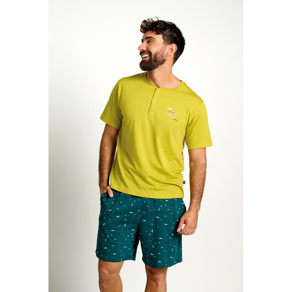 Pijama de algodón de manga corta y pantalón corto. Camiseta en color mostaza con tapeta en el cuello de tres botones y print en la parte izquierda. Pantalón de coilor verde a contraste con estampado de submanirnos. Bolsillos laterales y cordón de ajuste en la cintura.