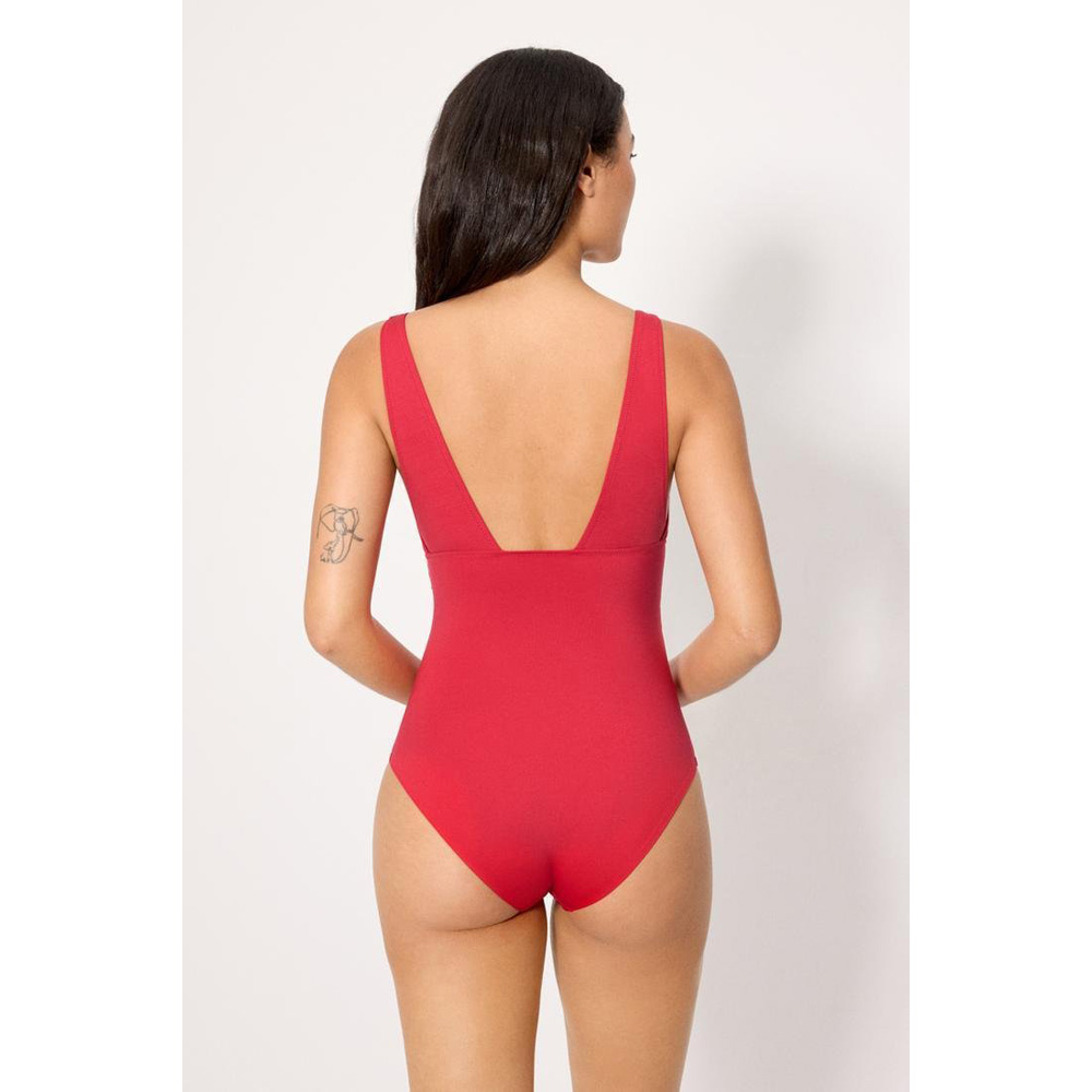 Bañador reductor con compresión en abdomen. Parte superior sin aro y con relleno extraíble. Tejido compresivo sin necesidad de forro. Diseño con escote en V.