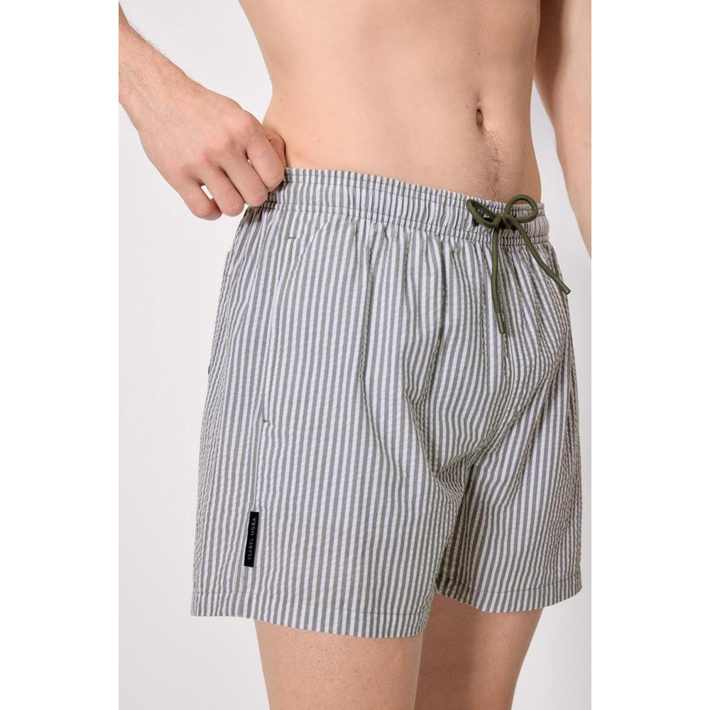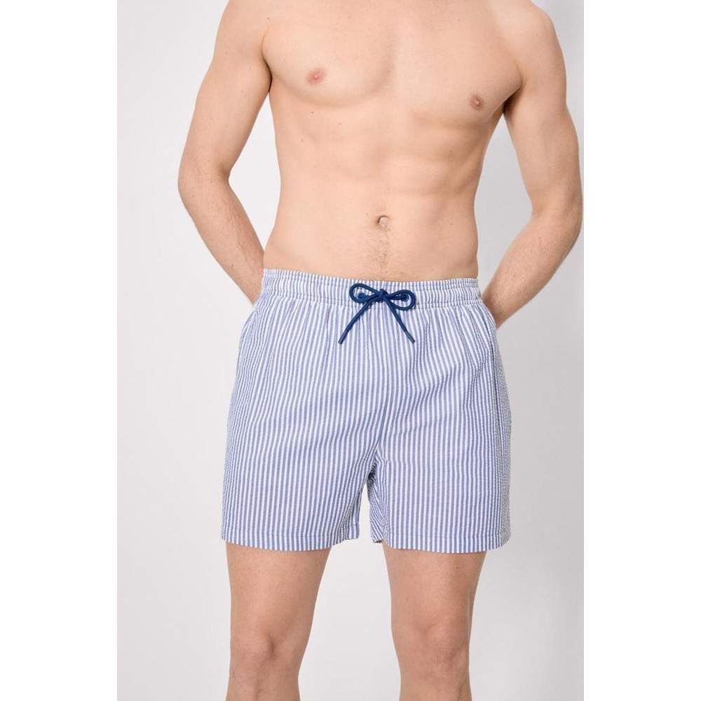 Bañador de corte medio para hombre. Tejido de secado rápido. Estampado de rayas verticales. Bolsillos laterales y trasero con evacuador de agua. 100% algodón. Cordón de ajuste en la cintura.